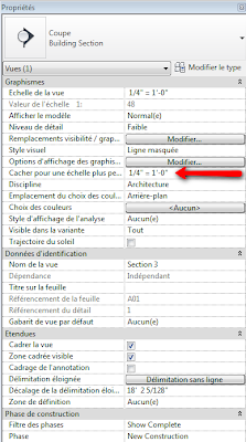 Avez-vous déjà été témoin qu'une ligne de coupe sur un plan à l'échelle 1:100 est invisible, mais sur l'échelle 1:50 elle est visible? Ceci est du à un paramètre de la vue qui s'appelle : cacher pour une échelle plus petite. Dans le cas de l'image ci-dessous, toutes les vues ou l'échelle est plus petite que 1/4" = 1'-0" (donc 1/8"=1'-0" par exemple) ne montrera pas la ligne de coupe.