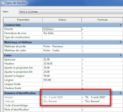 Avez-vous déjà eu le besoin de verrouiller un paramètre dans une famille pour qu'il ne soit pas possible de le changer dans le projet lui-même? J'ai l'habitude de créer un paramètre Version et Créé par pour chacune de mes familles, mais je ne veut pas que l'utilisateur puisse changer cette valeur dans le projet lui même. Alors, c'est très simple; pour verrouiller un paramètre il suffit d'écrire le texte dans la colonne Formule des Types de Familles et de lui mettre des guillemets avant et après. Voilà! Voir les images!